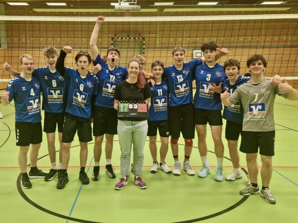 Die junge 3. Herren der VSG Ammerland schwimmt als Aufsteiger in der Bezirksklasse weiter auf der Erfolgswelle. Nach dem Doppelerfolg in den Heimspielen zum Saisonauftakt gelang dem Team nun ein deutlicher 3:0-Auswärtssieg (25:15, 25:15, 25:17) gegen den STV Wilhelmshaven II. Auch ohne die Leistungsträger Torje Scherer, Jannik Klockgether sowie Libero Ghulam Amadi geriet der Sieg in keiner Phase in Gefahr. „Das war eine geschlossene Mannschaftsleistung“, lobte Trainerin Claudia Stanke, die den erkrankten Torsten Busch an der Seitenlinie vertrat. Mit neun Punkten ist das Team souveräner Tabellenführer der Bezirksklasse.
