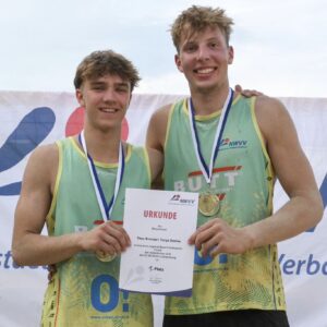 Mit einer starken Leistung in der Gruppenphase hat sich unser U19-Beacher Torge Damke mit seinem Oldenburger Partner Theo Brendel bei der Deutschen Meisterschaft in Laboe (Schleswig-Holstein) präsentiert. Leider verlor das VSG-OTB-Duo dann sein Über-Kreuz-Spiel und landete im sogenannten Loser-Baum. Am Ende holten die beiden den 25. Platz Somit ist es Torge und Theo nicht ganz gelungen, an die starke Vorstellung bei der Nordwestdeutschen Meisterschaft in Oldenburg anzuknüpfen. Dort hatten sie sich Ende Juni gegen mehrere starke Teams durchgesetzt und sich mit dem ersten Platz für die nationalen Titelkämpfe qualifiziert. 🥇… U19-DM als Abschluss einer tollen Beach-Saison weiterlesen - Von der Halle in den Sand
